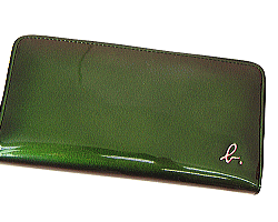 アニエスの財布のもう一つのポイントがシルバーのロゴプレートです。上記の紹介品はエナメル素材のラウンドファスナーですが両方エナメル素材で左側はパープルの内側、右側はグリーンの外観になります。